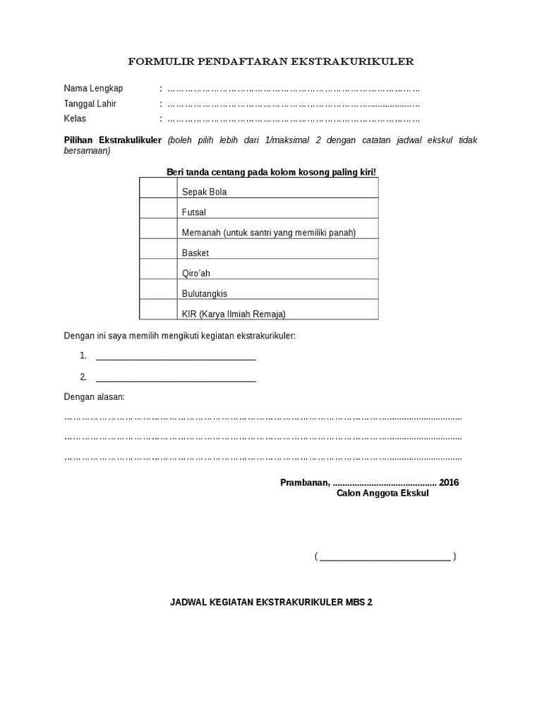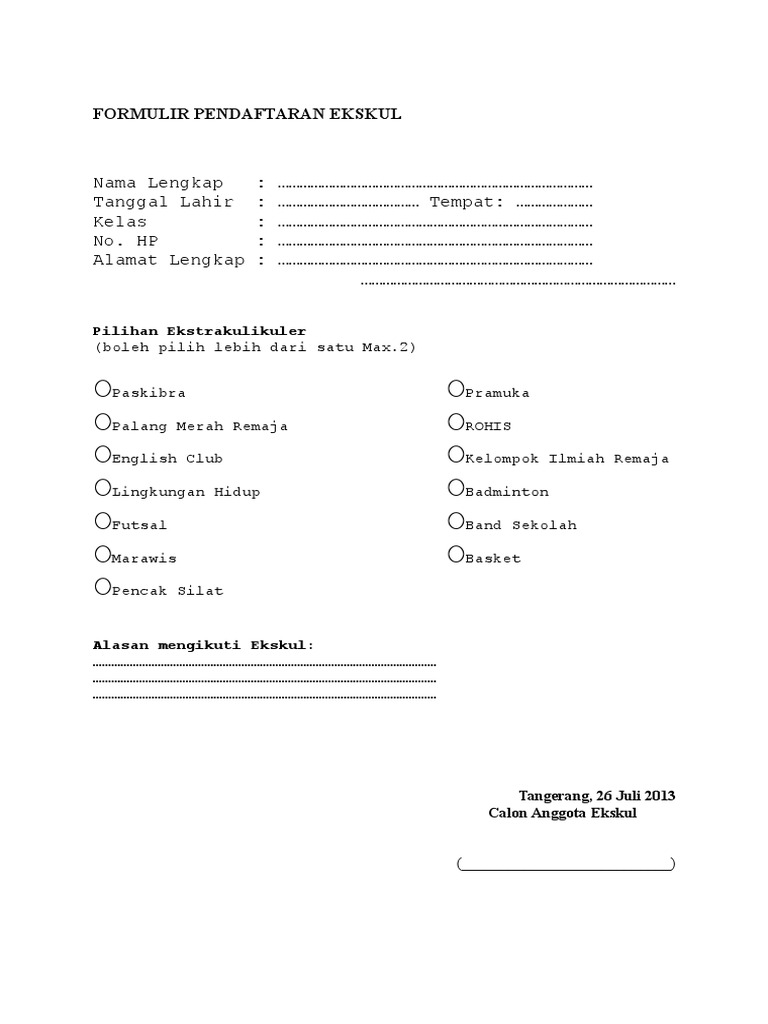 Contoh formulir pendaftaran ekskul. Sepak bola futsal memanah untuk santri yang memiliki panah basket qiroah bulutangkis kir karya ilmiah remaja dengan ini saya memilih mengikuti kegiatan. FORMULIR PENDAFTARAN EKSTRAKURIKULER Nama Lengkap Tanggal Lahir. Iuran ekskul sebesar rp 12500 per pertemuan1.